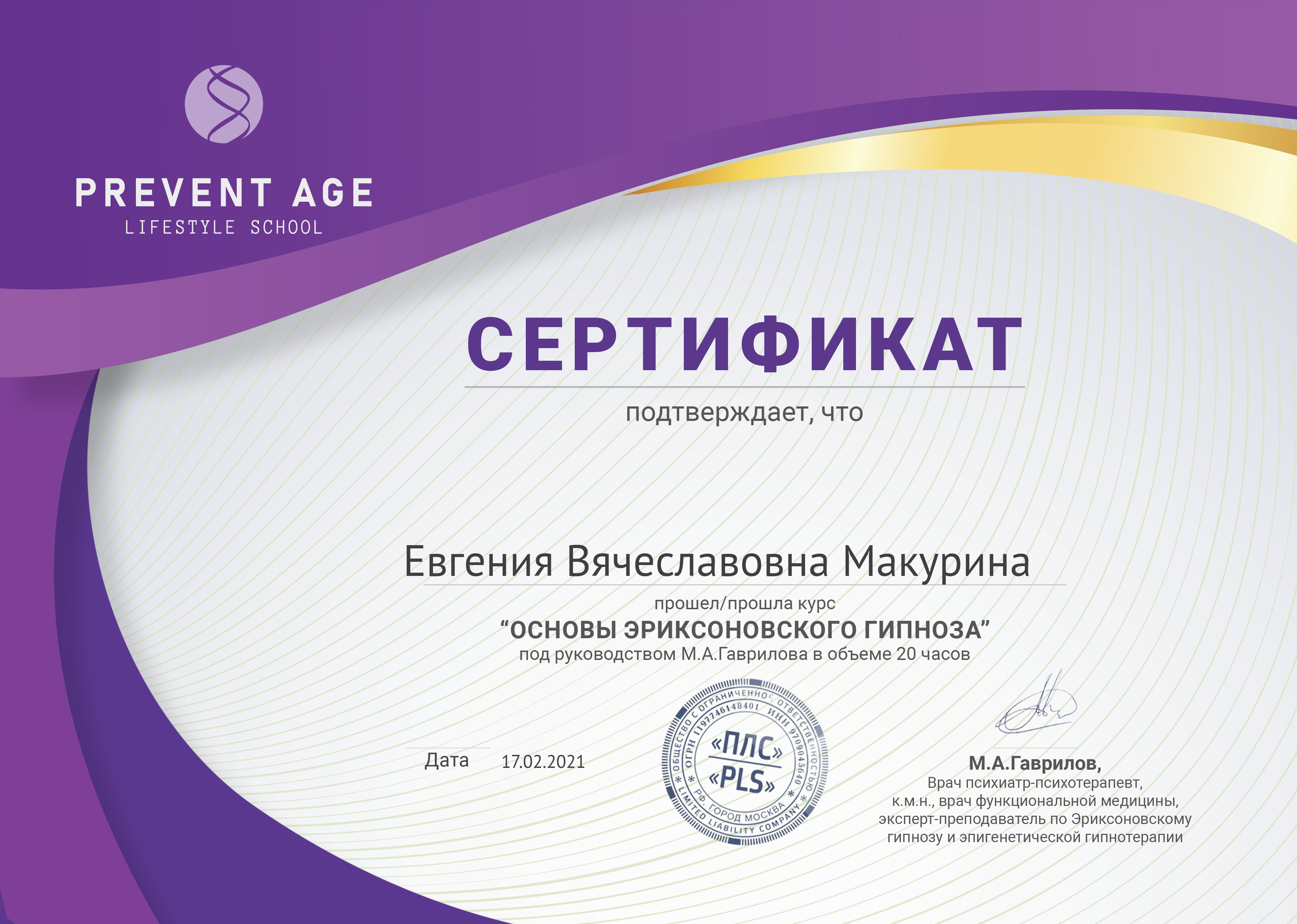 Получением диплома нутрициолога дело не ограничилось – в январе 2019 я начала 2-годичное обучение по специальности «Специалист по немедикаментозному оздоровлению и модификации образа жизни» на базе Международного института интегральной превентивной и антивозрастной медицины Preventage® (ныне УОМ — Университет образовательной медицины). В 2021 г. состоялась защита диплома, а также дополнительная сертификация по специальности «коучинг здоровья» и «эриксоновская терапия» (копии подтверждающих документов ниже). Кроме того, я продолжаю углублять свои знания в области нутрициологии и функциональной медицины каждый день, читая профессиональную литературу, участвуя в различных обучающих программах и семинарах.