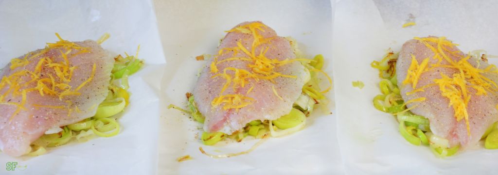 - Бумагу для выпечки порезать на прямоугольники шириной около 22-25 см. На каждый кусок бумаги выложить ¼ лука-порея, сверху положить по 1 филе тилапии (вдоль), посыпать тертой цедрой, сверху раскрошить по половинке ложки сливочного масла. Завернуть рыбу в конверты, скручивая края как фантики конфет.